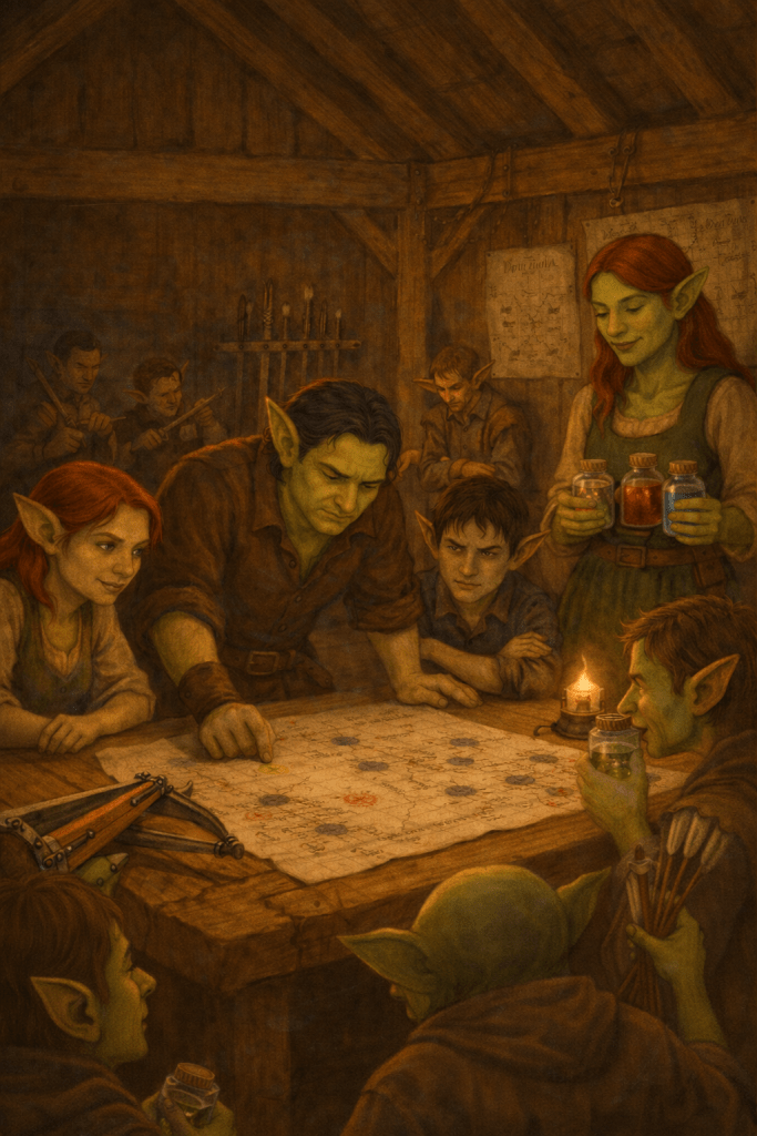 The war clock hung from the rafters of the barn, glowing red against the rough timber, ticking loud enough to feel in your bones. Even the younger goblins moved differently when that clock burned. The whole barn buzzed with activity. Attack plans being made, weapons being polished, and everyone collecting spell jars from Ma. It was a busy time.